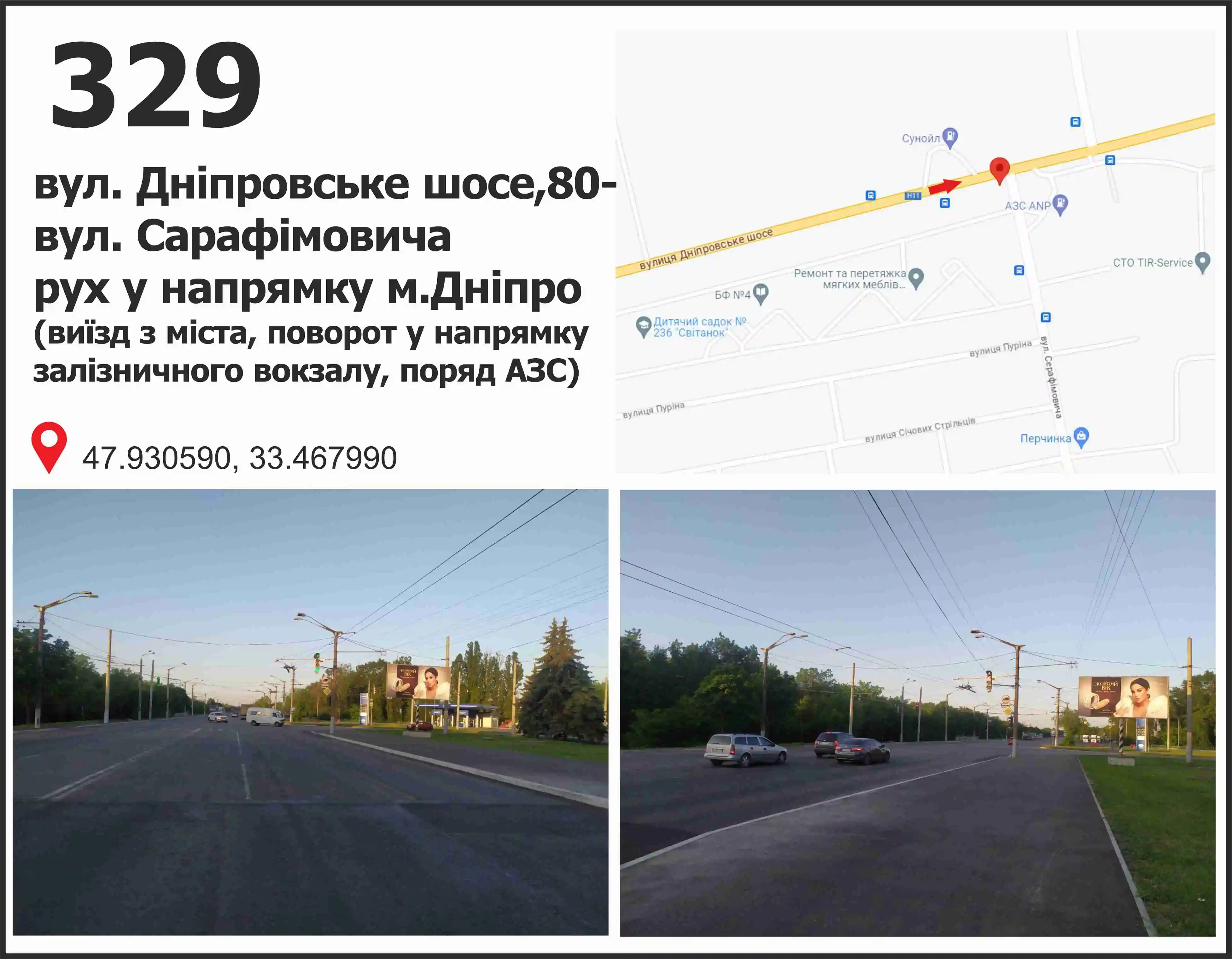 Билборд + в Кривом Роге вул. Дніпровське шосе,80-вул. Сарафімовича. Виїд у напрямку м.Дніпро, поворот у напрямку залізничного вокзалу, поряд АЗС