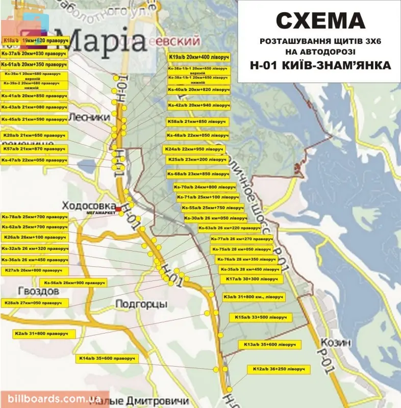 База насчитывает более 190 рекламных плоскостей в Лесниках (Киевской обл).