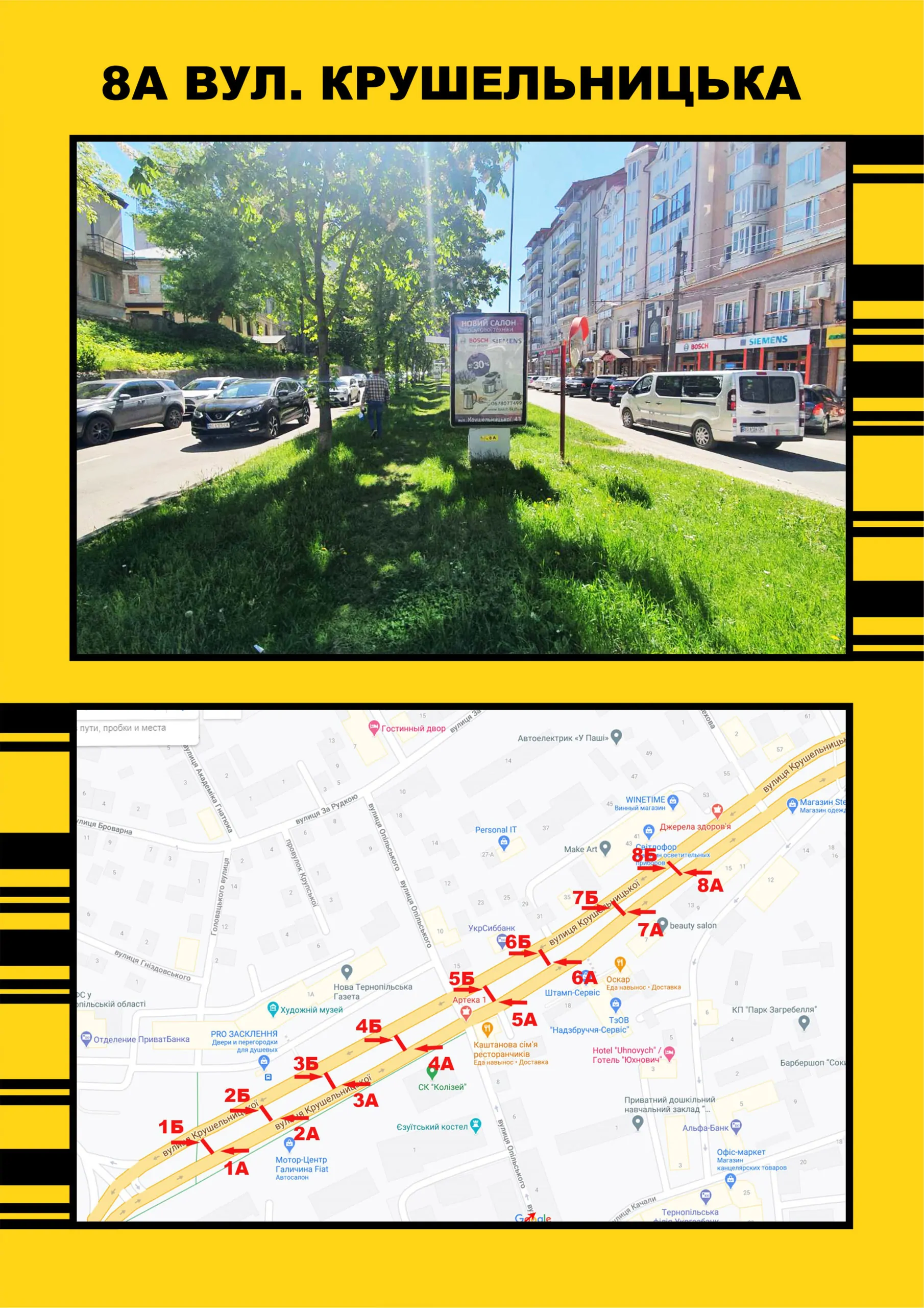 Цей Білборд розташований на одній з ключових транспортних магістралей Тернопільської області – трасі Козова-Тернопіль, безпосередньо біля важливого повороту на Зарваницю. Ця локація характеризується стабільно високим автомобільним трафіком, що прямує у напрямку обласного центру та до всеукраїнського паломницького центру в Зарваниці, який приваблює тисячі відвідувачів щорічно. Висока видимість конструкції забезпечує ефективний контакт з аудиторією, що рухається як з Козови до Тернополя, так і з'їжджає на паломницький шлях. Це ідеальне місце для просування товарів та послуг для автомобілістів, готелів, закладів харчування, туристичних компаній та брендів, орієнтованих на релігійний туризм. Ваша реклама тут охопить широку аудиторію: місцевих мешканців, пасажирів міжміського транспорту, паломників, туристів та водіїв, що регулярно користуються цією трасою. Великий формат Білборда гарантує максимальну помітність на значній відстані. Він ефективно працює протягом світлового дня, привертаючи увагу до вашого повідомлення. Бронюйте цю площину онлайн, щоб ваша реклама стала невід'ємною частиною маршруту тисяч подорожуючих.